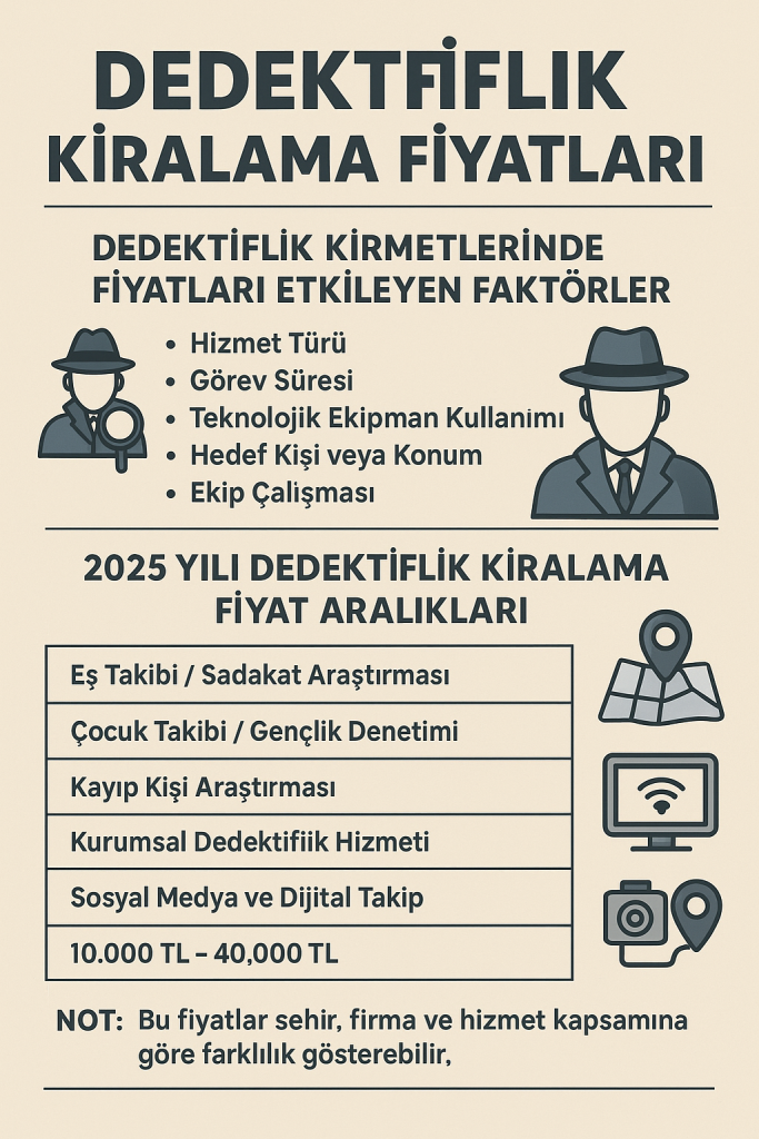 Dedektiflik Kiralama Fiyatları: 2025 Güncel Rehber Günümüzde bireyler ve kurumlar, özel yaşamda veya iş hayatında karşılaştıkları bazı durumlarda özel dedektiflik hizmetlerine başvurabiliyor. Özellikle eş takibi, kurumsal araştırmalar, sahte belge incelemeleri, çocuk takibi veya kayıp kişi bulma gibi hassas konularda dedektifler profesyonel çözümler sunuyor. Ancak en çok merak edilen konulardan biri, dedektiflik kiralama fiyatları oluyor. Bu […]